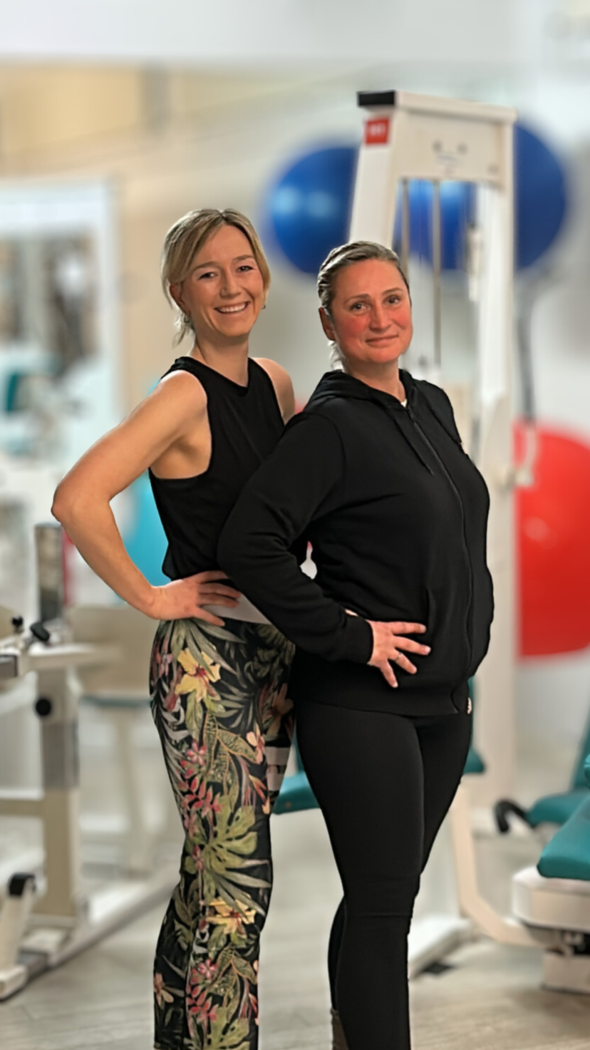 Zwei Frauen stehen zusammen in einem Fitnessstudio, beide tragen graue T-Shirts und lächeln.